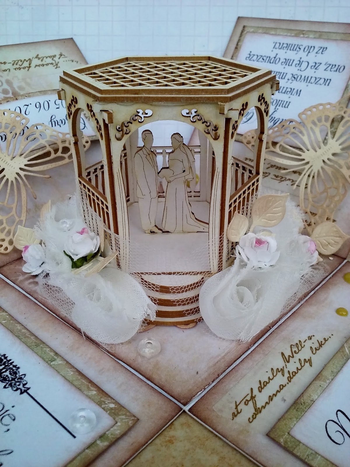 Hej kochani. Dziś pokażę ślubny exploding box w stylu shabby chic. Wykonałam go według jednego sprawdzonego wzoru, z ulubionym motywem altanki 3D. Miłego oglądania Wam życzę:)